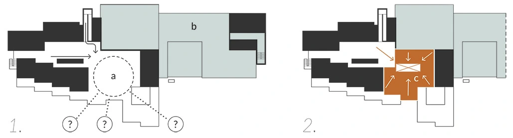 The project stitches together the void left by the removed veranda (a), reserving the other suggested intervention area (b) for future development. At the center, a new double-height space provides areas for meeting and study (c), becoming the heart of the extension. A new metal staircase (d), in addition to its safety function, acts as an architectural element that engages with the existing structure and defines the character of the expansion.